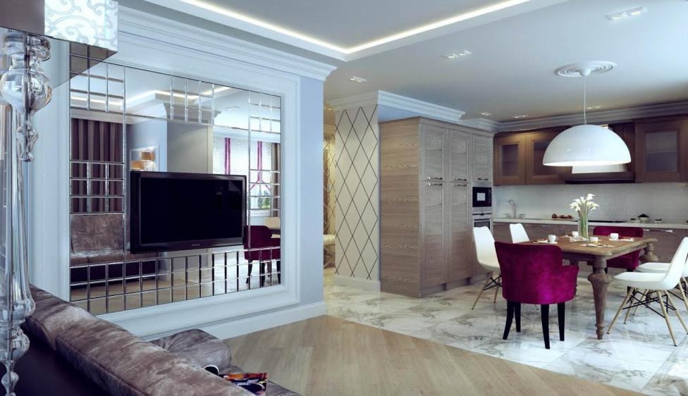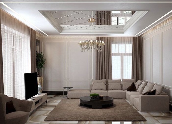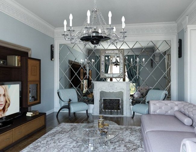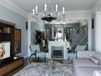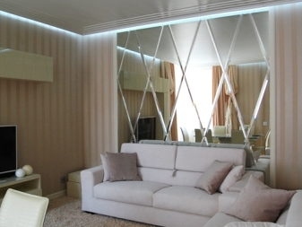 This design option is out of place in large rooms, in small living rooms a mirrored ceiling will help to increase the space. The mirror surface can be solid or lined with rhombus. Usually such a panel is placed on the whole wall.