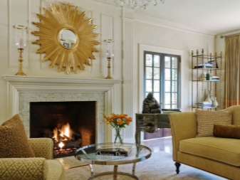 The mirror surface of a round shape over the fireplace harmoniously fits into the interior design. The framing of the mirror is designed in the form of the rays of the sun. Next to the product there are two small lamps.