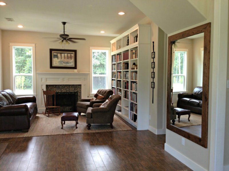 - To visually increase the area and change the shape of a rectangular room, you need to hang a mirror on a long wall. So the size of the room will visually become twice as large, and its shape will appear square.