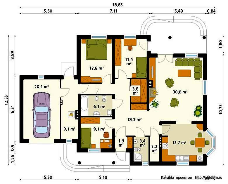 To build a one-storey house with a garage on the plot, you must first decide what specific premises it will be. Do you need a house with two or three bedrooms, is there a bath, sauna, terrace, or maybe a glazed veranda? The answer to this question is being discussed by all family members. After the number and purpose of the rooms is determined, the issue of their location is solved.