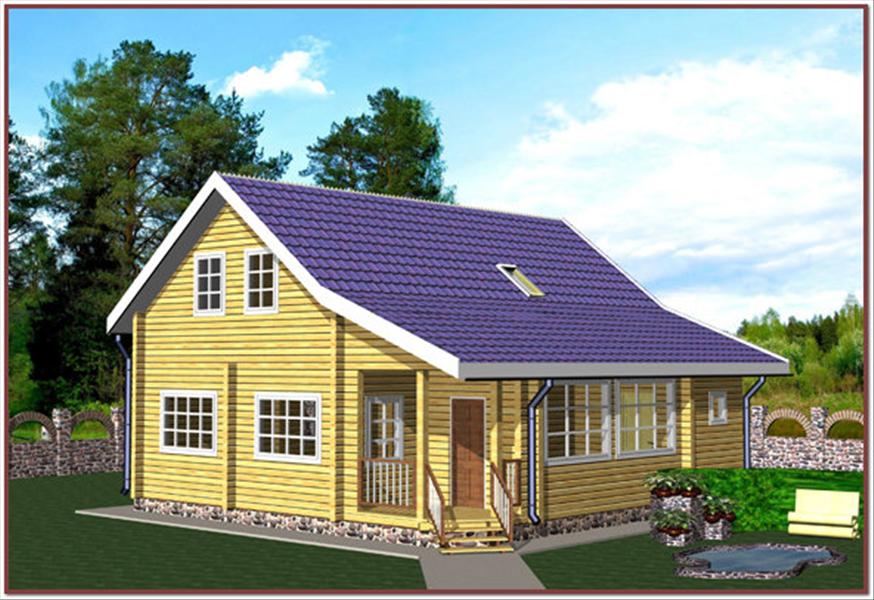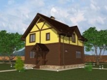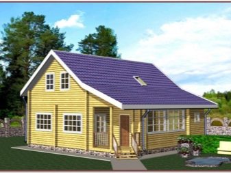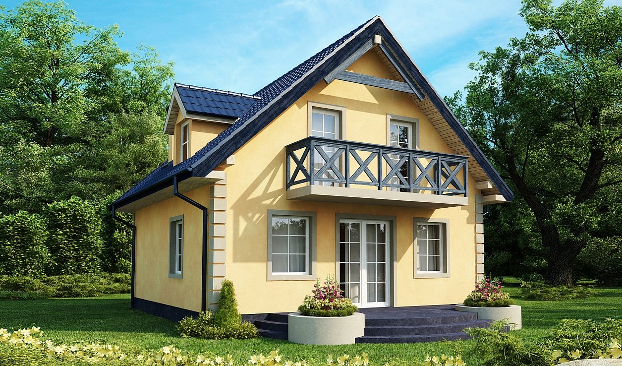 Light yellow walls, over which a graceful blue roof is located, look attractively against the background of the same colored porch. From the attic you can go to the balcony, the fence of which is made of diagonally spaced elements. One of the windows of the attic is perpendicular to the general plane of the house.