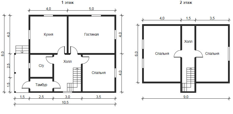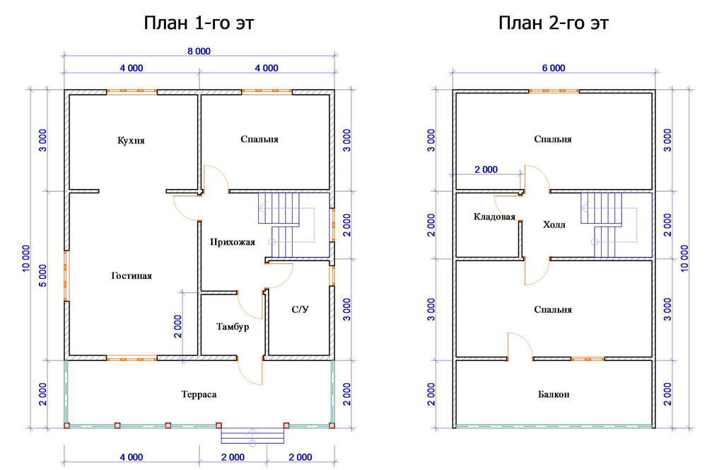 The project of the house 8 by 10 m is quite popular, it can be used in places with very dense buildings. Such constructions are very compact and economical (due to their small size, it does not take a lot of money to build and finish), while the overall functionality does not suffer at all. A house with sides of 8 and 10 m fits well in a narrowed or very small area, can get a strictly individual layout.