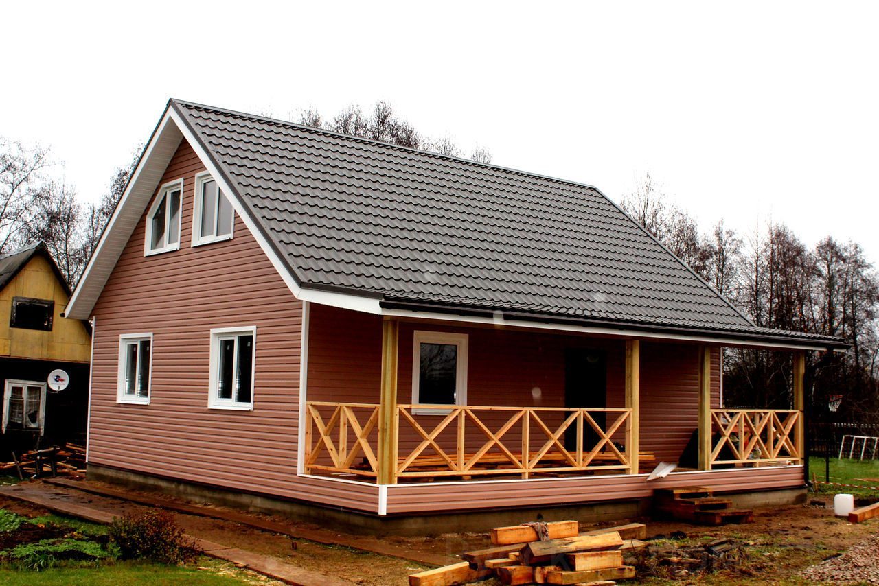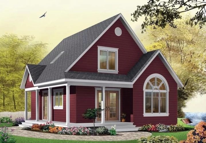 A two-storey house measuring 8 by 10 m, decorated with dark pink siding, is complemented by an attic. There are two separate entrances in different parts of the building. In addition to ordinary windows, there is also a figure, and the roof is covered with elegant gray tiles.