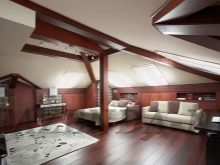 Attic on the existing wooden house is made as easy as possible, given the weight of the furniture in this room. Today, there are many architectural and design workshops that can offer ready-made designs of wooden buildings with an attic, the preparation of an individual plan will require more time and material costs.