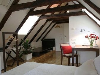 Arrangement of attic in a wooden building should be carried out using light materials, it will help the room not to look gloomy. The most suitable in this case will be the decoration of the internal surfaces of the house with a tree. It is not necessary to hide the rafters under the drywall, they can simply be sanded and varnished. And if the wood is artificially aged, then you can get a room in a rustic style.