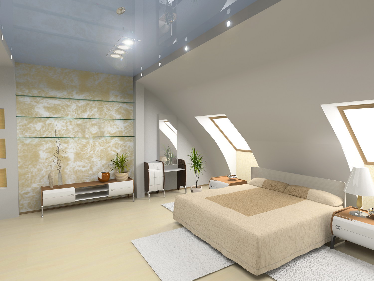 One chandelier inside the attic room will not be enough, it is best to additionally use spotlights or a few spotlights. You can zone the room with the help of lighting and simple partitions such as shelving, arched structures.