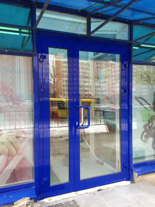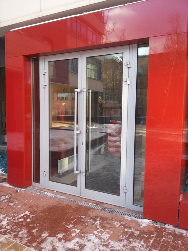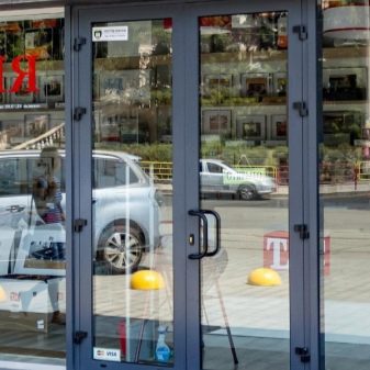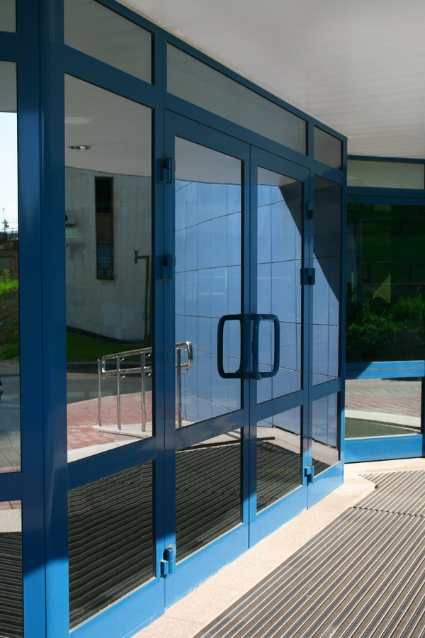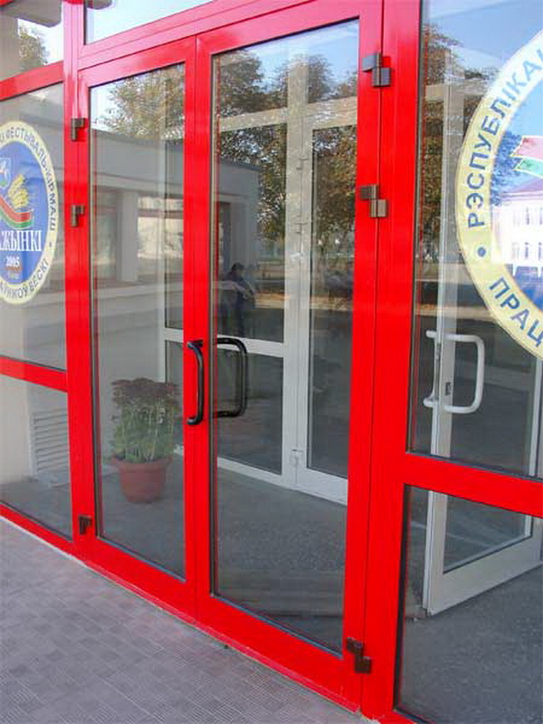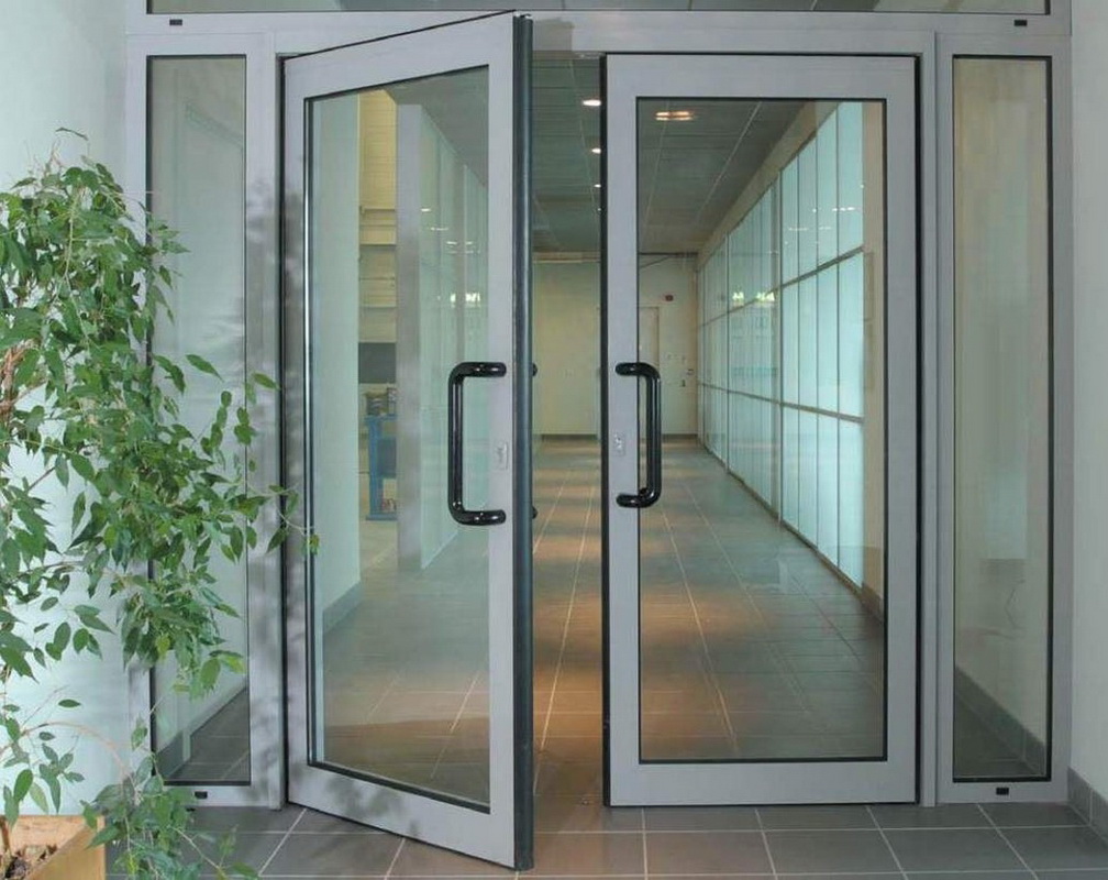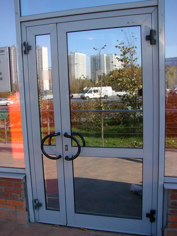 Double-leaf aluminum doors, as well as single-leaf, are subspecies of pendulum. They are in demand where there is not just a large flow of people, but it also changes its direction. The handle and the press set are included in the standard set of the aluminum office door; during installation it is necessary to take care of the seal around the entire contour.