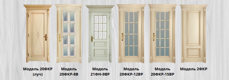 The manufacturer offers a separate arch, panels for doors, linings, baseboards and various door elements of the decor of veneer, solid, enamel or stained glass. Both single and double doors are manufactured. It is possible to create a design with a sliding window (transom). This type is usually used for large openings or for openings of complex, non-standard forms: