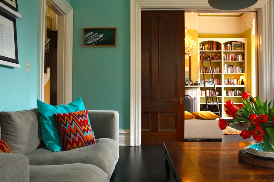 Beautifully looks a large sliding paneled door separating the home office and living room.