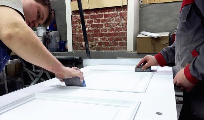 - Cleaning up First of all, you should remove the old protective coating (paint, varnish). For this, the door is either ground or the paint is removed by heating. You can choose a specific option depending on the type of coating.
