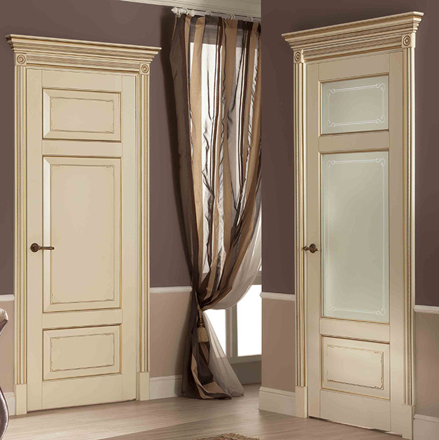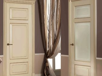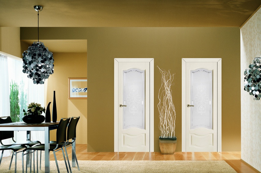 The door in a light shade will help to make the room more comfortable. Models, complemented by gold-plated inserts or frosted glass, will harmoniously look with pastel decoration of the room. Particular attention should be paid to the door handles. For an interior in a rustic or Scandinavian style, suitable copies with beautiful gilded fittings.