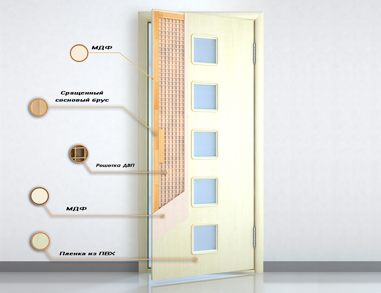 As noted above, laminated doors consist of several basic elements. At the heart of these products are used both synthetic and natural materials. Thanks to this, it is possible to achieve high quality doors and their durability. The basis of the door is a wooden canvas.