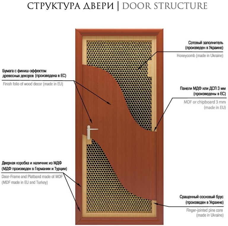 The design of laminated doors consists of several important elements. The basis of the models is presented in the form of a frame made of bars. The inner part of the construction is filled with special cells made of corrugated cardboard. Because of this, laminated models are durable and reliable.