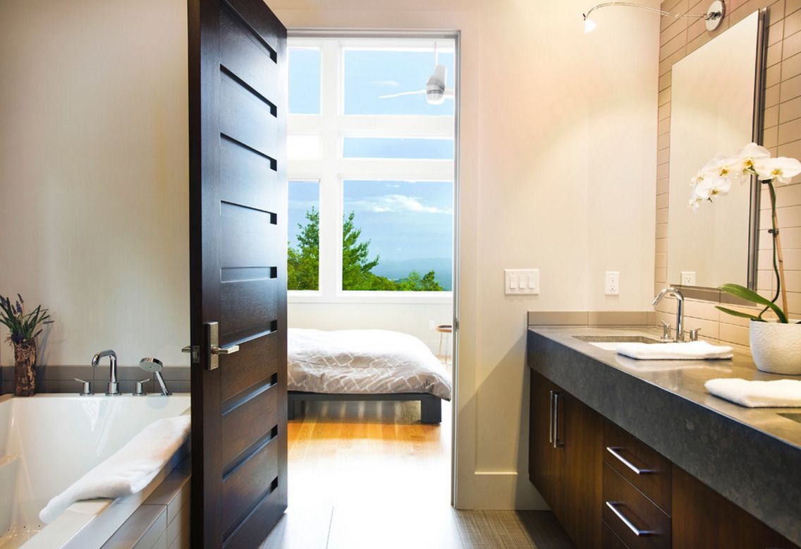 A good option for classic and modern design would be a door with asymmetrical glass inserts. Such models advantageously complement the interior, bringing some personality into it. It is best to choose doors with frosted glass, as they look more attractive and stylish.