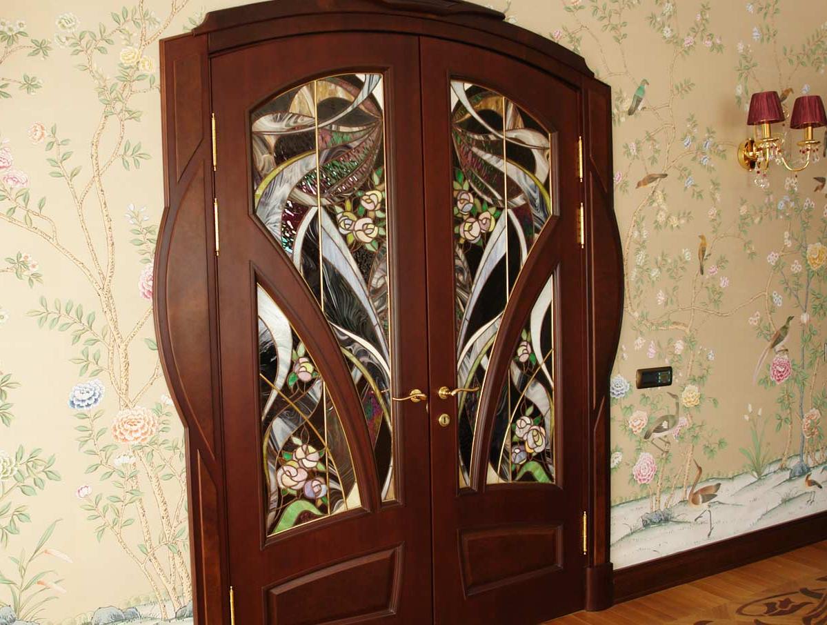 - Original and modern look laminated doors in modern style. The peculiarity of most structures is the absence of symmetry. Often laminated doors in this style complement the stained glass with paintings.