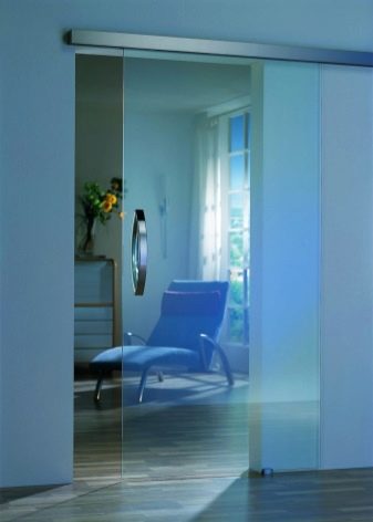 - Suspended - the system is attached to the guide, located on the wall just above the opening, moves along it with the help of special rollers. This door looks original, saves space in the room or corridor, depending on the place of installation. In such products, insulation of noise and drafts is weaker than in previous versions. The canvas on the suspension mechanism drives off to the side of the opening, you need to take into account this fact. In the side where the door will move, you need to leave an empty section of the wall.
