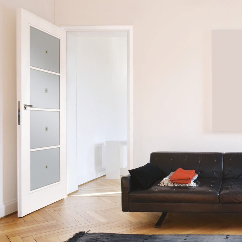 Someone may think that the white doors do not fit into the modern interior or they are too simple. This question can be solved by applying a creative approach, changing the glazing to a brighter one, applying the original pattern or placing the appliqué.
