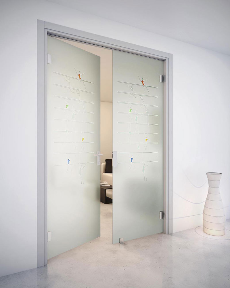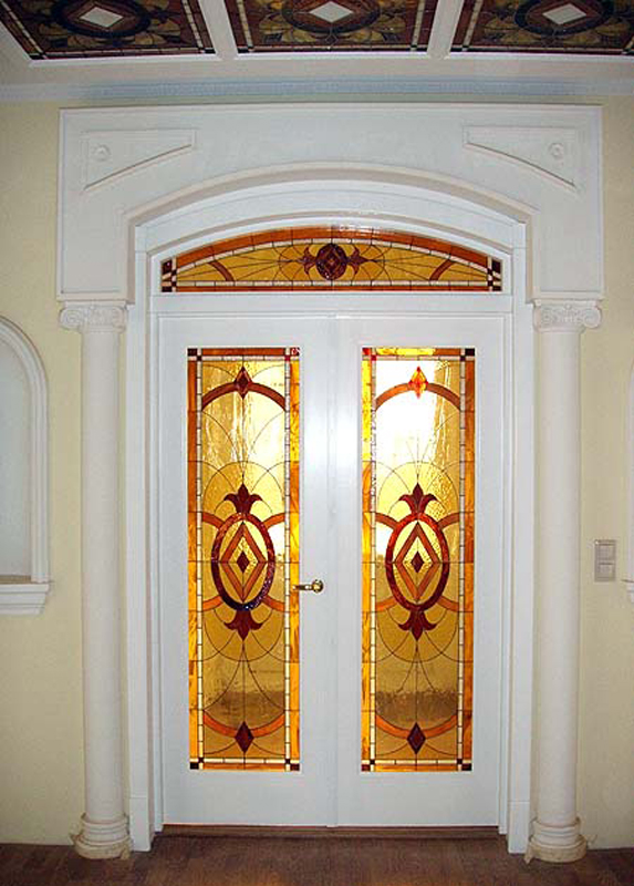 Stained glass window - glass door decoration. A peculiar mosaic of multi-colored glass pieces allows making doors of works of art. In modern production often use a slightly different technology - stained glass film. Decorative, painted pieces of light-penetrating material are glued on a solid glass sheet, thereby creating the necessary pattern. The joints are glued with thin metal strips (broach). Also called the stained glass door with maximum glazing.