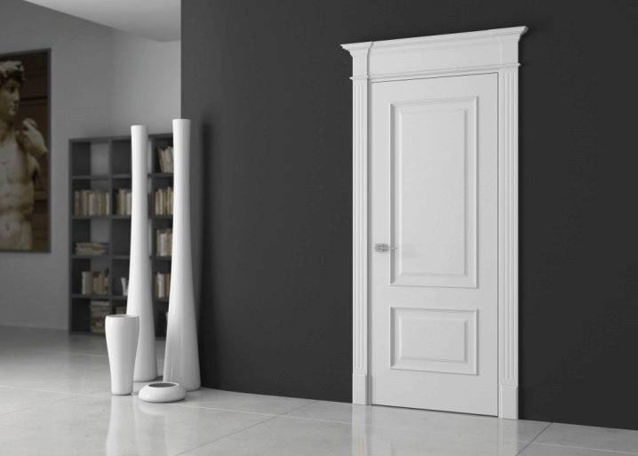 On bright walls, an excellent option for a white interior door would be to use the same ceiling and floor plinth. They, like a graceful frame, emphasize the saturation of the walls and support the color of the canvas.