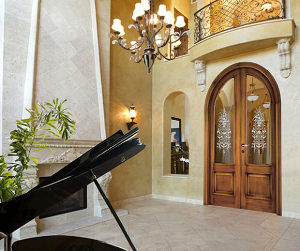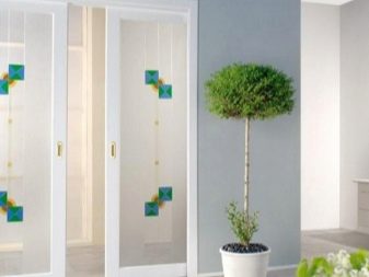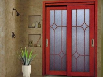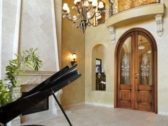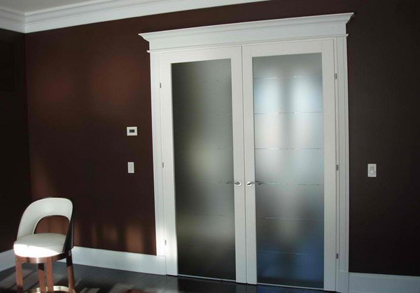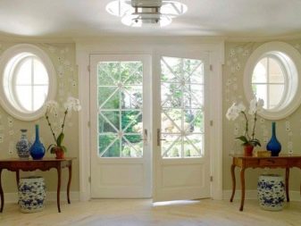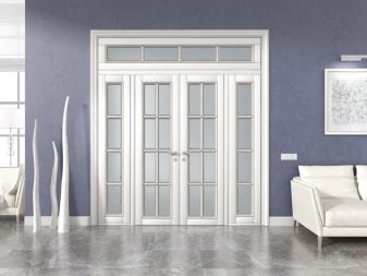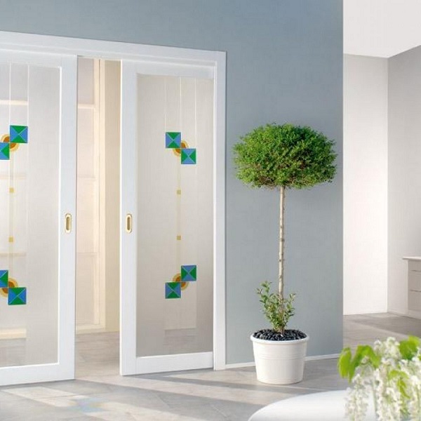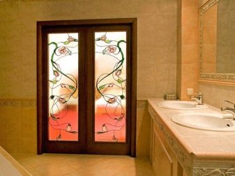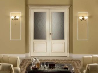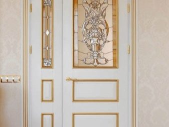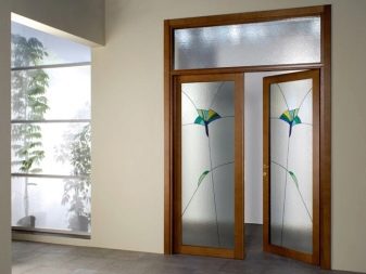 As inserts often used stained glass, elegant and luxurious. To enhance the impression, a semicircular arch decorated with the same glass elements is mounted above the door frame. Most often, the color of the door leaf and accessories echoes the shades that are present in the furniture.