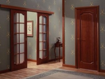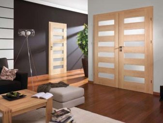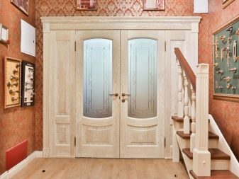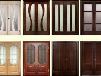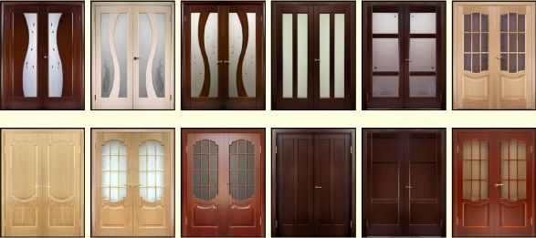 The existing double doors have a significant difference in production materials. This may be natural wood, called an array, or its substitutes. Also produce plastic and glass models. For the entrance doors, metal frames are used, which are refined with wooden overlays, with inserts made of tempered glass or plastic.