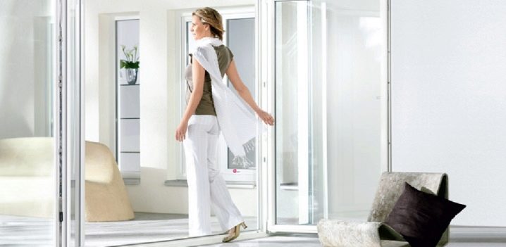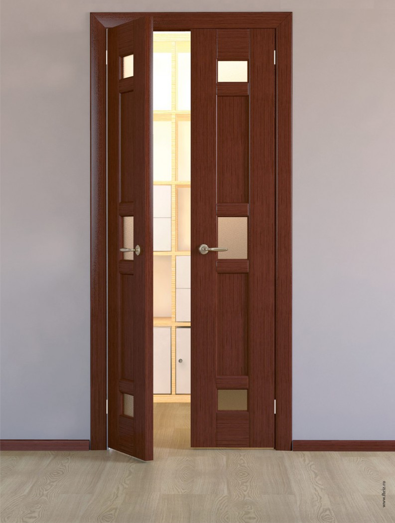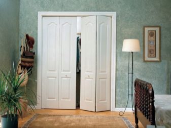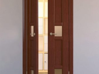 - Folding, or door- "accordion", representing two pairs of narrow single-leaf canvases interconnected by means of hinges.They are attached to the door frame on the hinges, when opening a pair of shutters are shifted in opposite directions.
