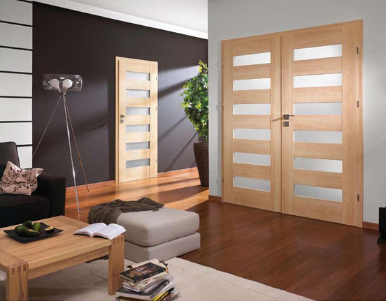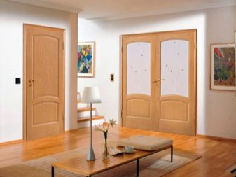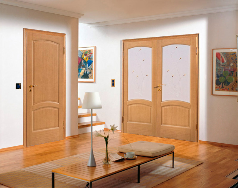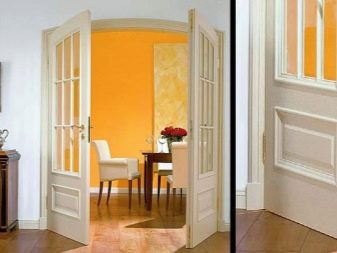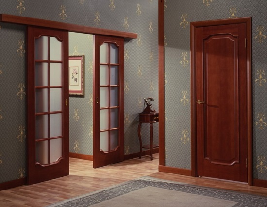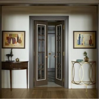 In the design of these doors there are two doors in one door frame. This option is convenient for doorways, the width of which is more than one meter, and therefore they cannot be closed by a single door leaf. Most often, such internal openings are left to enter the hall or the living room to emphasize the ceremonial purpose of the room, so the double doors require special appeal and full compliance with the overall style decision of the interior.