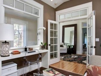 For example, an amazing impression is made by the interior with the presence of a double door having white trim and toughened frosted glass inserts. This door provides a bright and attractive contrast with the walls decorated in brown tone, but at the same time it is combined with white wide plinths, accessories of electrical equipment and furniture that has white finish. Since the door frame and the molding above it are also white, they harmoniously combine the doors and the ceiling surface.