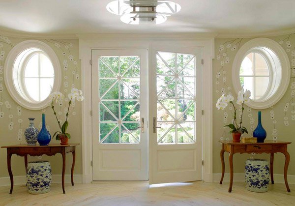Elegant doors from the array with glass inserts, often called "French", are ideal as patio doors that serve to exit the house to the veranda.They have a noble shade of ivory color, which is repeated in the decoration of unusual round windows, baseboards and delicate floral pattern on the walls. The presence of openwork baguette inserts in the door leaf creates a feeling of lightness and lightness of their design, indicating the owners' refined taste.