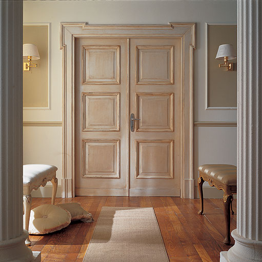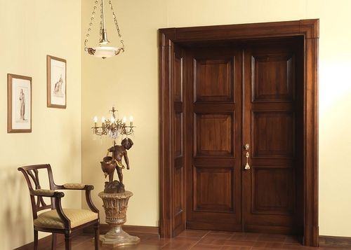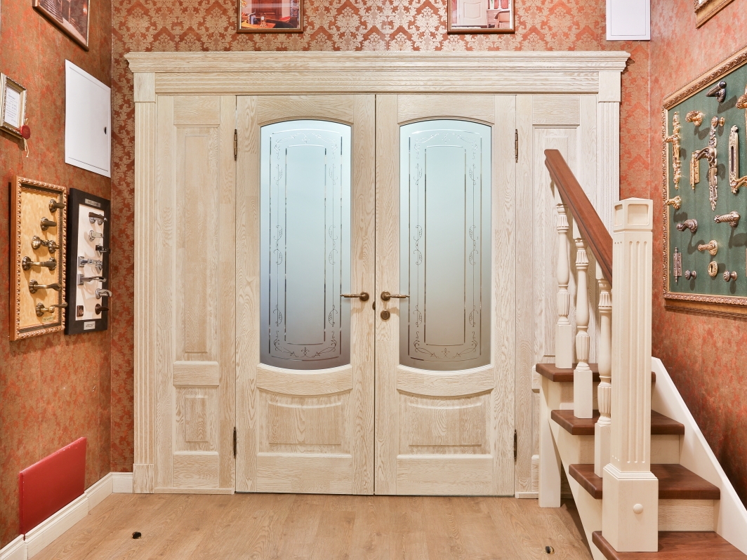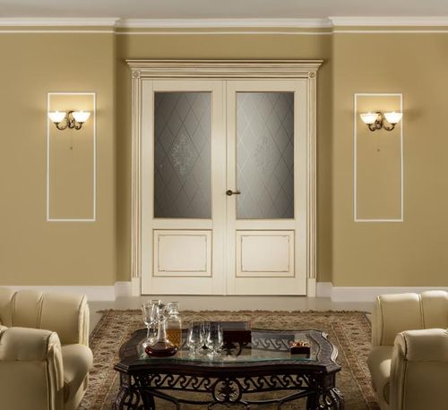 Swing doors are most convenient to adapt to traditional interiors. They look familiar, and therefore fit particularly well into the classic versions of window design, furniture placement and choice of lamps. In most cases, two door halves are installed, having a fully symmetrical pattern and size. In especially pompous rooms, for example, decorated in the styles of art nouveau, baroque, and Victorian classicism, two-door panel structures of solid wood with applied patterns or glass inserts are installed.