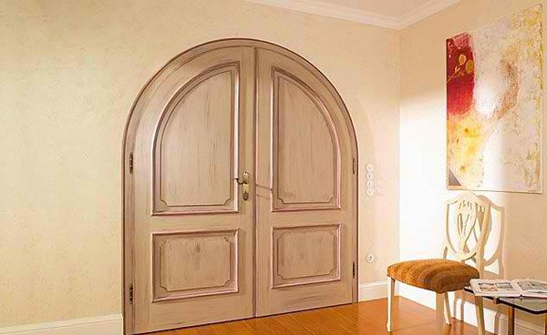 Custom-made double-leaf doors of non-standard design can turn a typical room into a room of a medieval castle. A semicircular arched door frame, canvases made from solid natural wood and painted with a patching effect, inconspicuous inserts-panels - all the elements of the decor of this door wonder remind of the ancient traditions of design. The discreet palette of the room is fully consistent with the neutral color finish door panels.