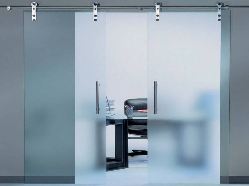 Glass doors suspended in a frameless way will enhance the feeling of free space that is characteristic of modern interior designs. Furniture on metal legs and lamps of futuristic forms will be able to emphasize such doors.