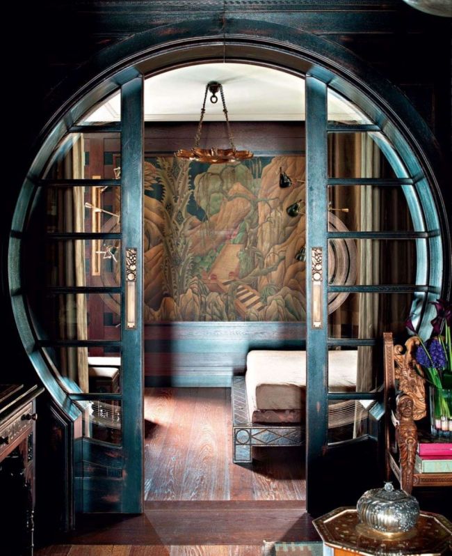 Doors-screens, called "shoji", harmoniously complement the interior in Japanese or Chinese design. Being essentially a variation of the compartment doors, they hide inside the wall, saving space inside small living spaces.The material used as inserts or, in authentic designs, special Japanese paper, is organically combined with curtains and screens in traditional oriental styles.
