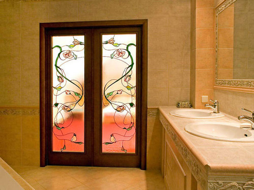 Glass door leaves can be stained or monophonic. In the case of stained glass, whether it is a classic stained glass window in Tiffany style, fusing or sandblasting with applying varnish tinting, the colors of the door are consistent with the overall style of the room. Usually stained glass doors protrude solo in the interior, which is chosen precisely taking into account the color and pattern of glass.