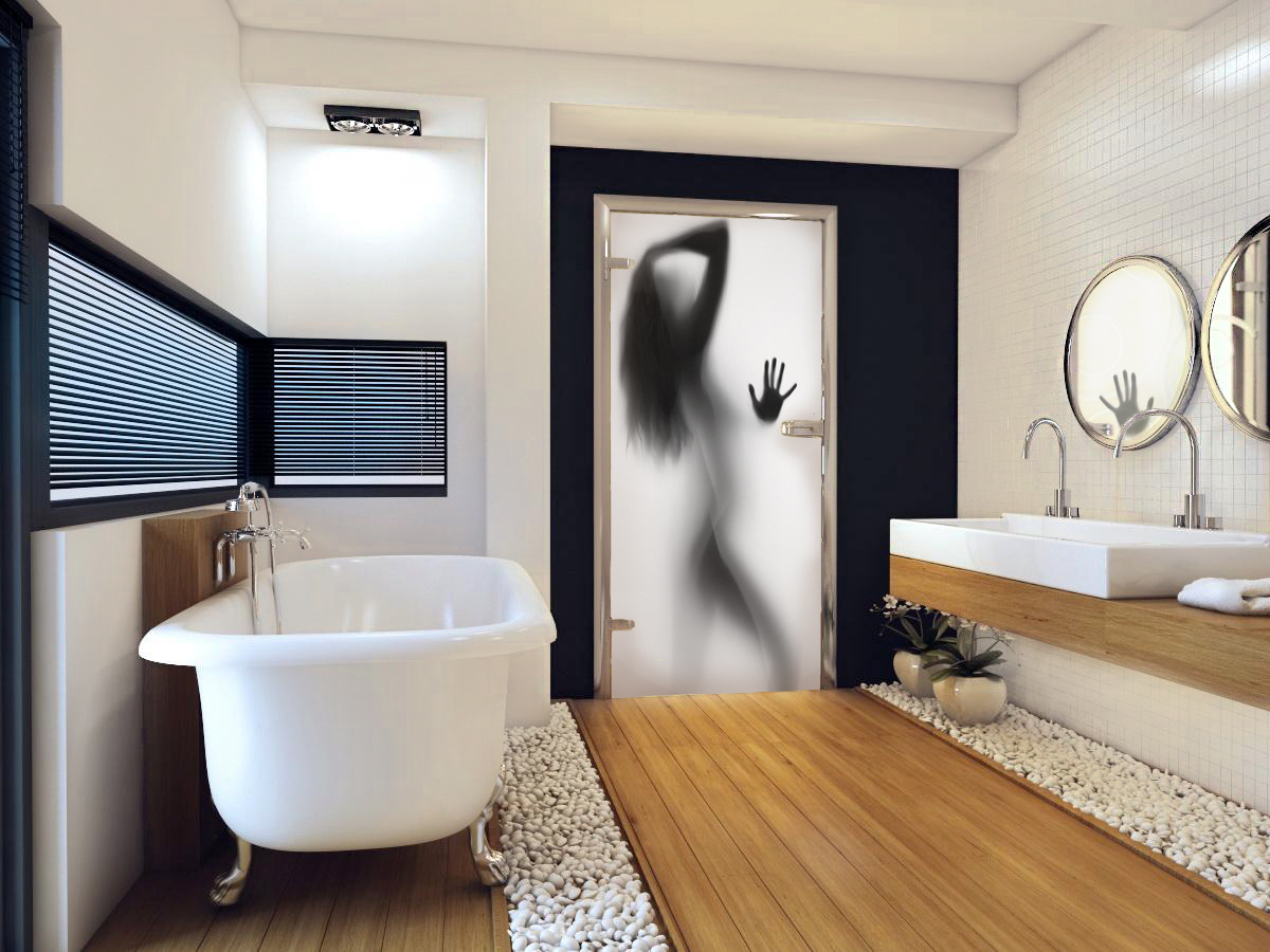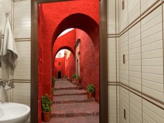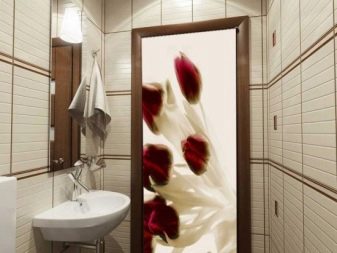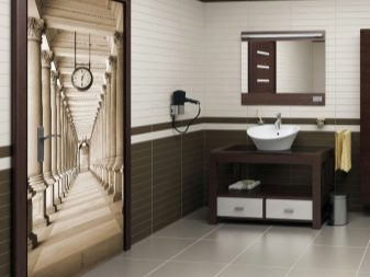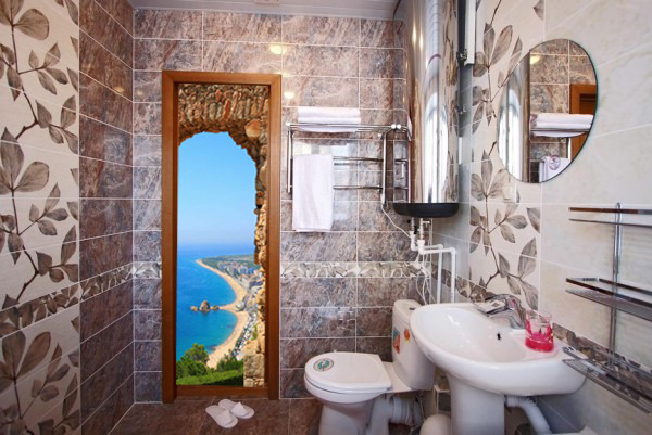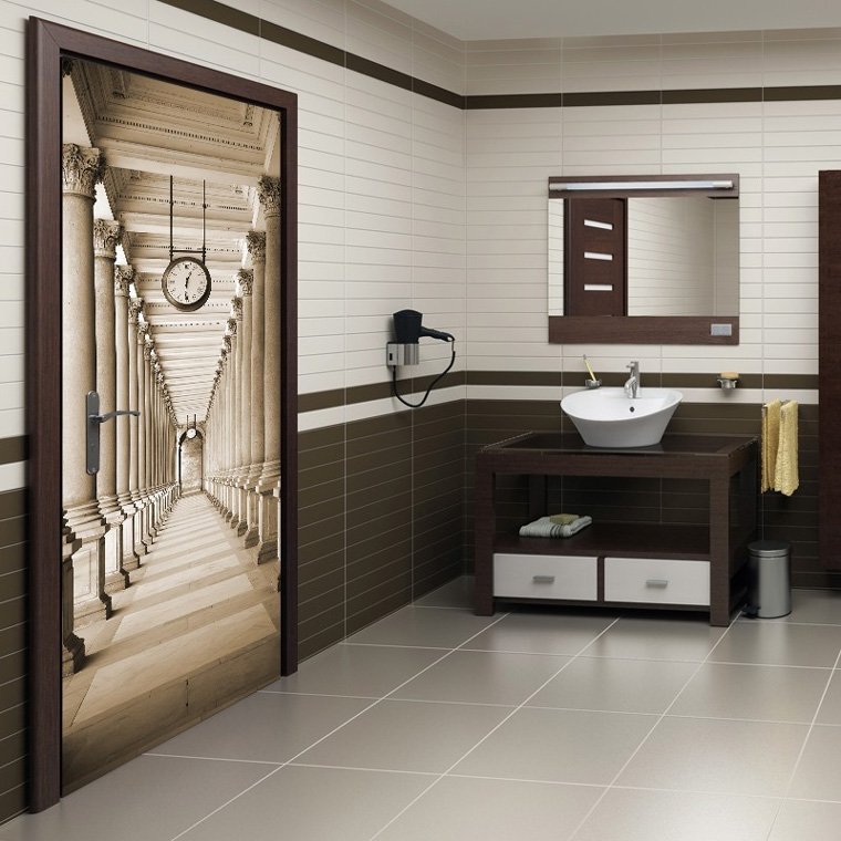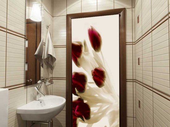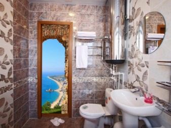 Effectively and inexpensively arrange photowall-paper and you can door to the bathroom. Only in this case, suitable moisture-proof, strong wallpaper based on vinyl with antifungal impregnation. Themes may be the most diverse: the inhabitants of the depths of the ocean, sea plants, beaches with a surf, a sailboat or a storm at sea. Three-dimensional three-dimensional images look original and modern, transferring their gaze to another reality.