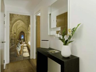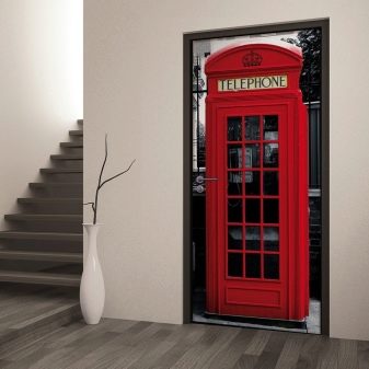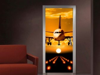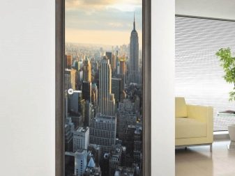 With the help of photo wallpaper, you can quickly and with a minimum cost to transform the door under the overall style of the interior. This material is perfect for the decoration of the compartment door, especially if you choose narrow canvas with a pattern on the vertical. The result is a very fashionable and unusual design solution.