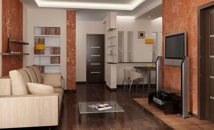 Walk-through living room requires special attention. Need to carefully consider the entire arrangement of furniture. It is necessary to skillfully maneuver between openings. Smooth walls are best left for dimensional objects. On the opposite side, the TV and the shelves fit well.