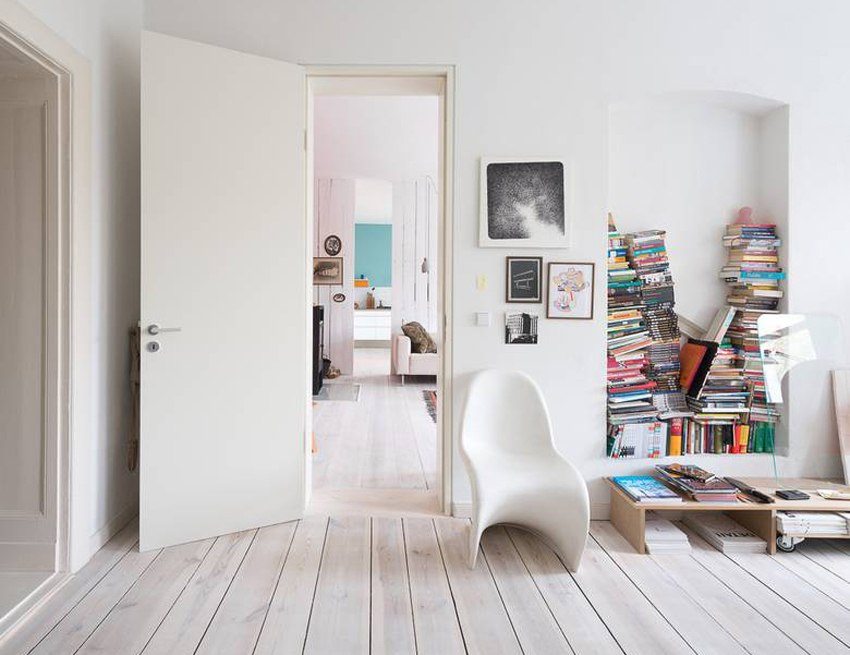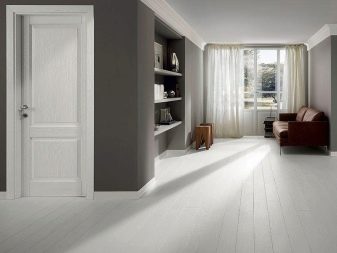 - White. Interior solution for white interior doors should be modern and concise. The snow-white door perfectly harmonizes with the most different colors of wooden floors, linoleum and laminate. You just need to take into account that each color can have shades of warm and cold tones.