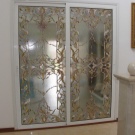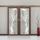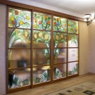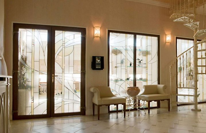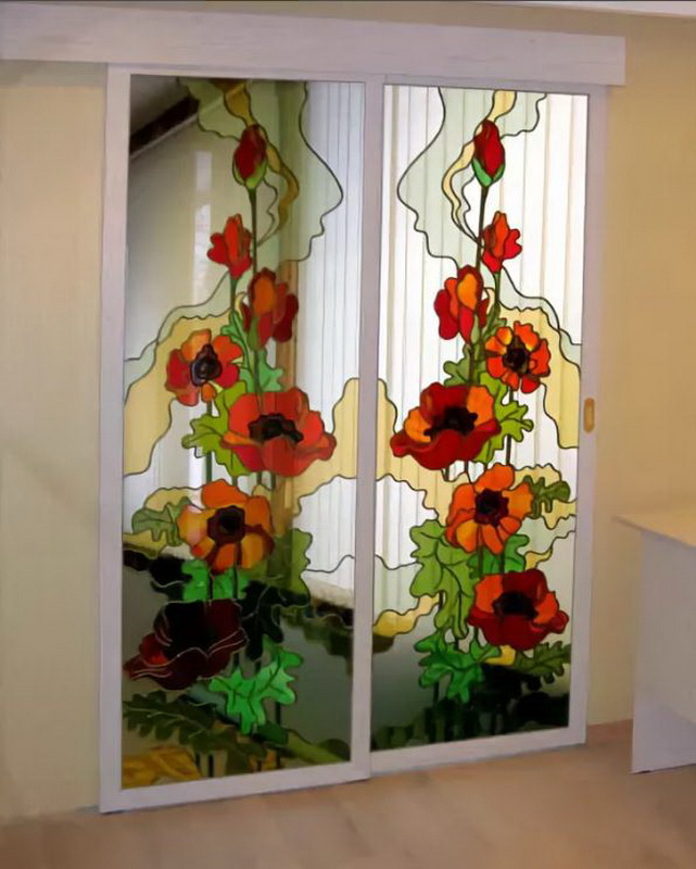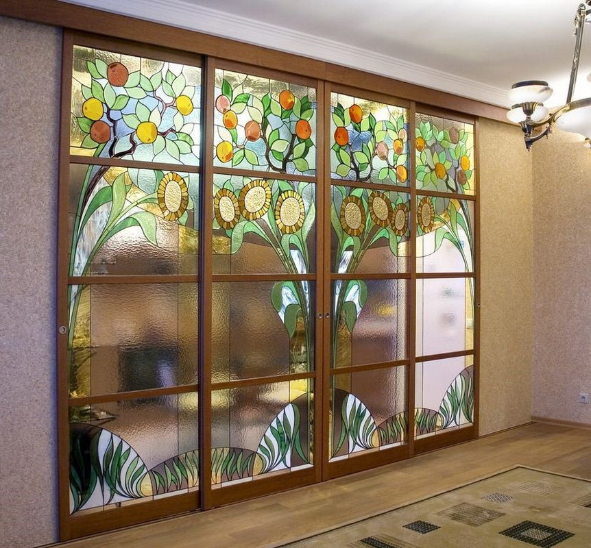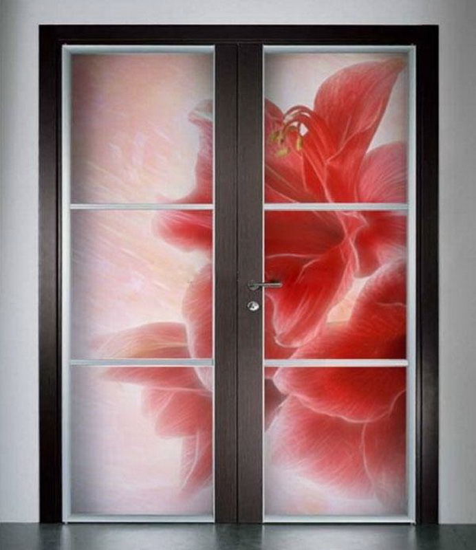 Layouts can cost the owner much cheaper if an option is chosen that is simply glued to the glass using a special composition. Such a sticker lasts a long time, and if desired it can be easily changed. Of course, for a strict classical interior a cheaper accessory may not be the best option. In this case, it is better to order a door with glass inserts, which will be divided into several figured segments of regular shape in order to withstand the entire ensemble as practical and strict as possible.