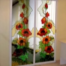 A great way to decorate plastic doors so that they cannot be distinguished from their counterparts from natural materials - options with a layout. Layouts are all kinds of decorative elements that fit inside the door. It can be glass, divided into several segments in the form of symmetric squares, inside of which there is a colored pattern, artfully imitating stained glass.There are many variants of such decor, and any of them can permanently rivet the eyes of an inexperienced visitor.