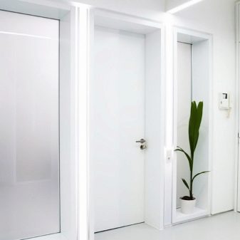 It is known that white metal-plastic doors can most often be seen in kindergartens and in almost all medical institutions due to the fact that they have increased hygiene and ease of care.If there is a desire to put soft-white doors at home, an option made of MDF with PVC film coating will be the most preferable - and it looks natural and looks quite like home.