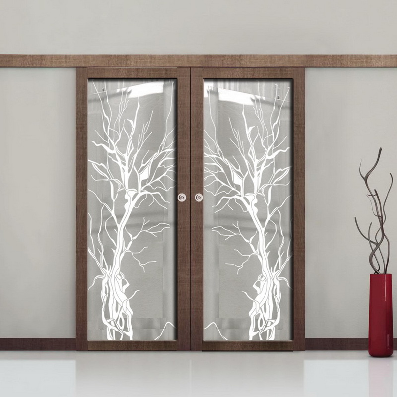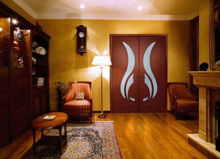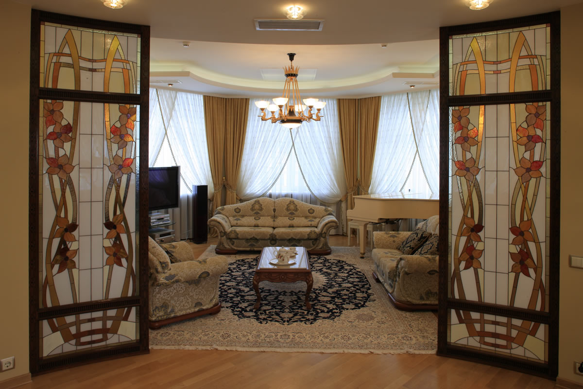 As for the residential sector of any private house, doors made of plastic with a laminated coating, made with taste, can be put in any room. Glass decoration in its various versions will be most preferable: if there is a desire, you can even order stained glass for the doors to the living room or bedroom. If the house has a large kitchen, again it is worth mentioning once more about interior doors with cassette doors, which will save a lot of space and will not allow smells from the kitchen to freely enter residential premises.