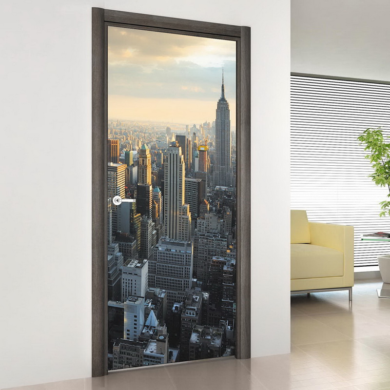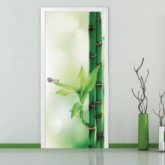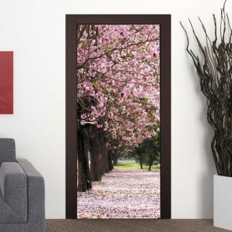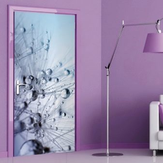Self-adhesive film for the door is a sheet, rolled into a roll. Its outer side can be different in color and texture and performs a decorative function. The inner side is a sticky adhesive surface, through which the film is attached to the door leaf. The adhesive surface is protected by a special sheath to prevent the material from sticking.