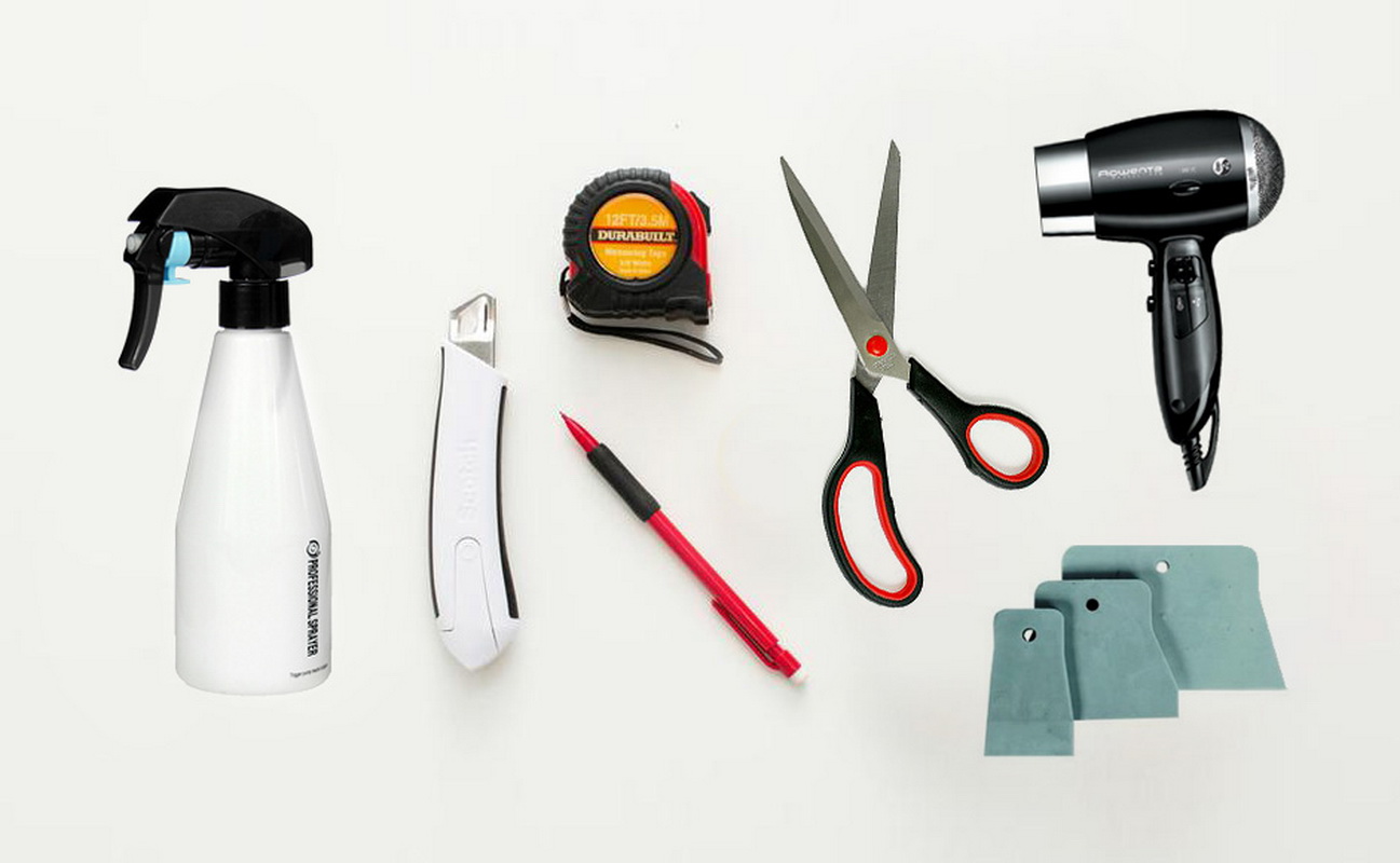 Before you glue the film, prepare the necessary tools: scissors or a stationery knife (as it is more convenient for someone), a simple pencil, a ruler-tape measure, a rubber spatula, a spray bottle filled with water, a hairdryer and a needle. A hairdryer will help when working with uneven surfaces - carved details, corners, as the heating of the material will make it more plastic. This is especially true when pasting the door pillars. And with the help of a spray gun, you can change the position of the material. To do this, you will need to moisten the door before pasting. Water will prevent fast adhesion of the film to the door. Needle is needed to get rid of any bubbles with air on the material.