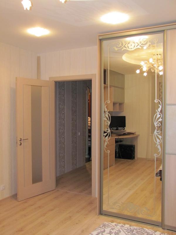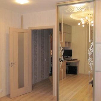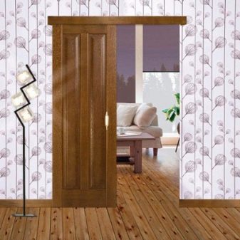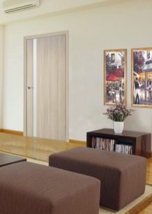 - Another convenient type of framed doors are sliding structures. Such systems can be equipped with one or two large flaps, which are mounted on special rollers and "slide" on the top andbottom rail at the time of opening / closing. Such options are ideal for rooms with a small yardage.