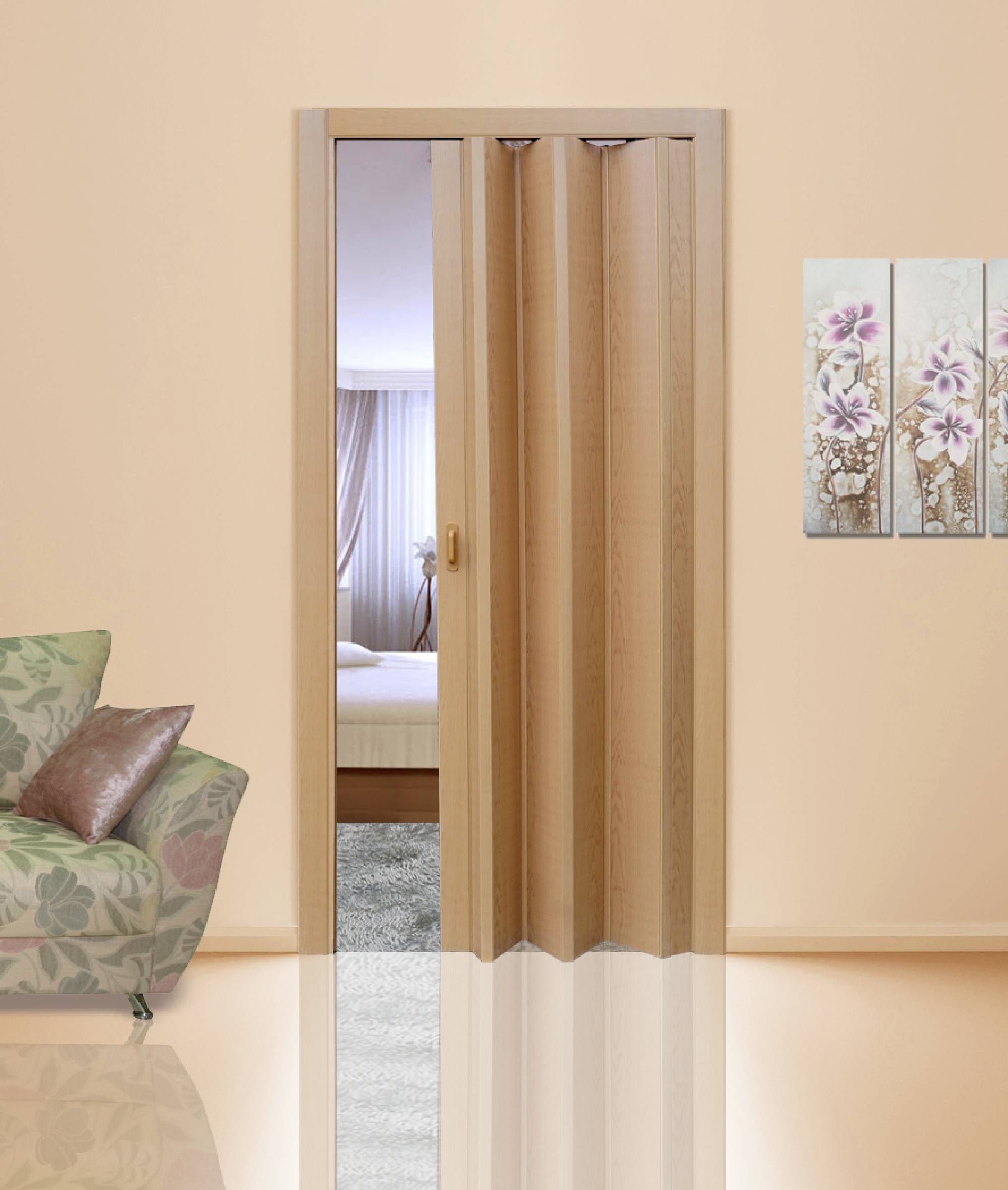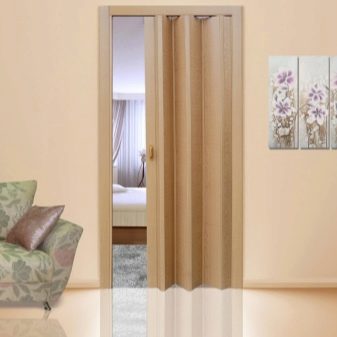 - Folding doors look more original. Otherwise, such products are called "accordions." These designs consist of several narrow shutters fastened together by special hinges. Such doors are attached to the base box on ordinary hinges. When you open these constructions, the flaps beautifully move to the side. However, many buyers as a disadvantage of "accordions" highlight the impossibility of installing locks or latches in them.