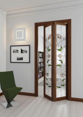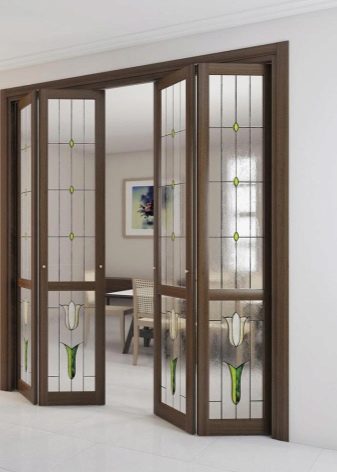 Dark folding doors collect only positive reviews on the Internet. They look interesting and attractive. For example, luxurious dark designs with glass inserts and stained glass patterns will look impressive on a snow-white background.