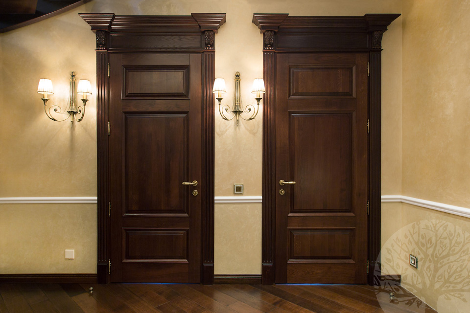 Dark oak doors look elegant in tandem with pale yellow, peach or beige walls. Two high canvases can be installed at a short distance from each other in a similar room and wall wall sconces between them can be placed in a classical manner.