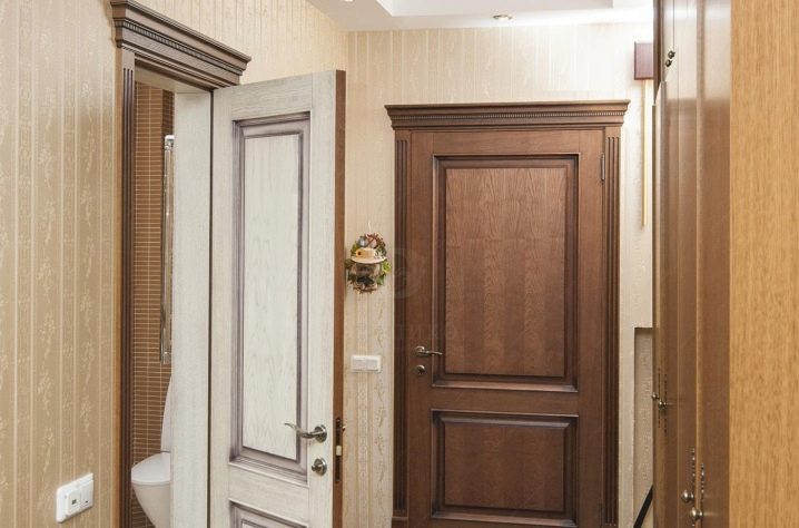 A two-color door with a brown (outer) and white (inner) leaf can be installed in a light corridor with a brown-parquet floor and decorated with beautiful frames with carved details.