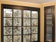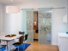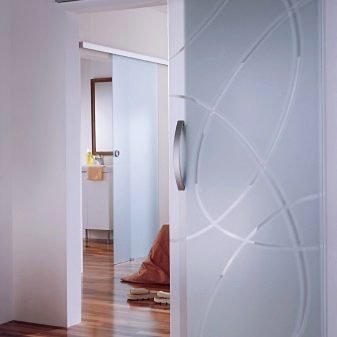 - Glass texture. Doors made of glass are not just related to a separate group. They are difficult to combine with the decoration of the floor or walls, but at the same time they ideally overlap with the decor of the room and its texture and color gamut.